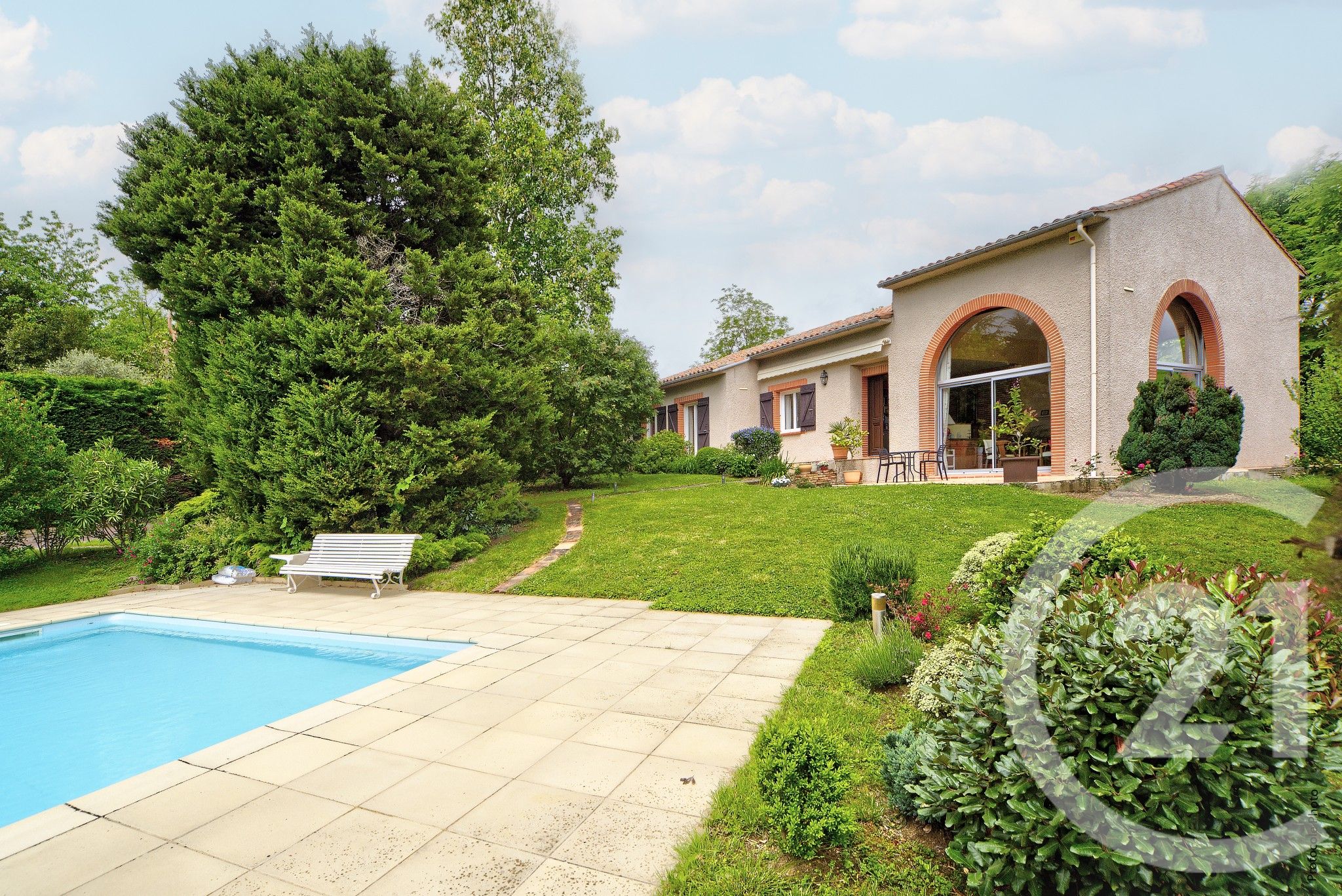 À l'extérieur, le jardin paysager de près de 2 500 m² constitue un écrin de verdure. Arboré et agrémenté d'une piscine, il invite à la détente et au plaisir des saisons, dans un environnement privilégié et parfaitement au calme.